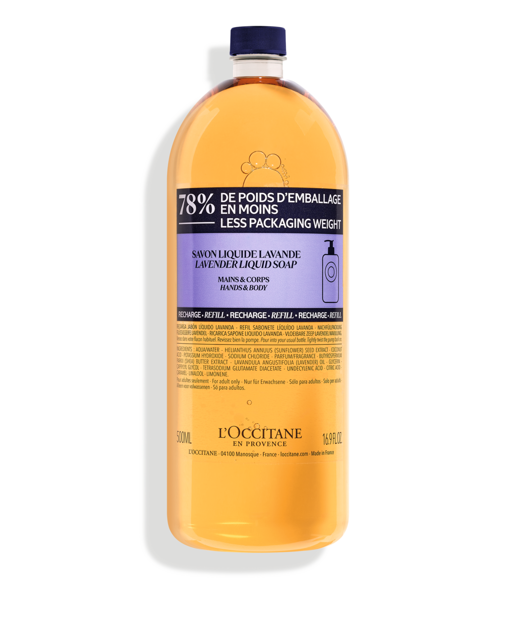 AQUA/WATER - HELIANTHUS ANNUUS (SUNFLOWER) SEED EXTRACT - COCONUT ACID - POTASSIUM HYDROXIDE - SODIUM CHLORIDE - PARFUM/FRAGRANCE - BUTYROSPERMUM PARKII (SHEA) BUTTER EXTRACT - LAVANDULA ANGUSTIFOLIA (LAVENDER) OIL - GLYCERIN - CAPRYLYL GLYCOL - TETRASODIUM GLUTAMATE DIACETATE - UNDECYLENIC ACID - CITRIC ACID - CARAMEL - LINALOOL - LIMONENE