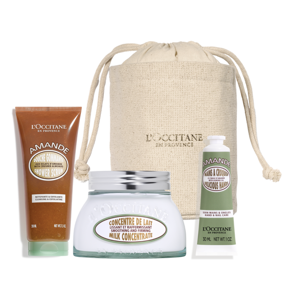 Uživajte u celokupnom bademastom ritualu koji hidrira, omekšava i ostavlja kožu svilenkastom na dodir. Badem piling za tuširanje nežno uklanja mrtve ćelije i priprema kožu, koncentrovano mleko za telo pruža dubinsku hidrataciju i učvršćujući efekat, dok krema za ruke obavija kožu mekoćom i toplim bademastim mirisom. Spakovan u elegantan poklon neseser–džakčić, ovaj set je savršen za darivanje ili lični momenat uživanja.